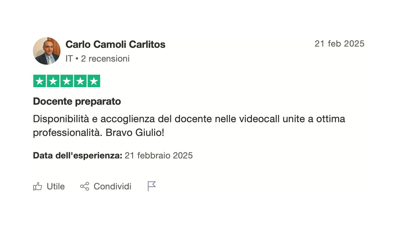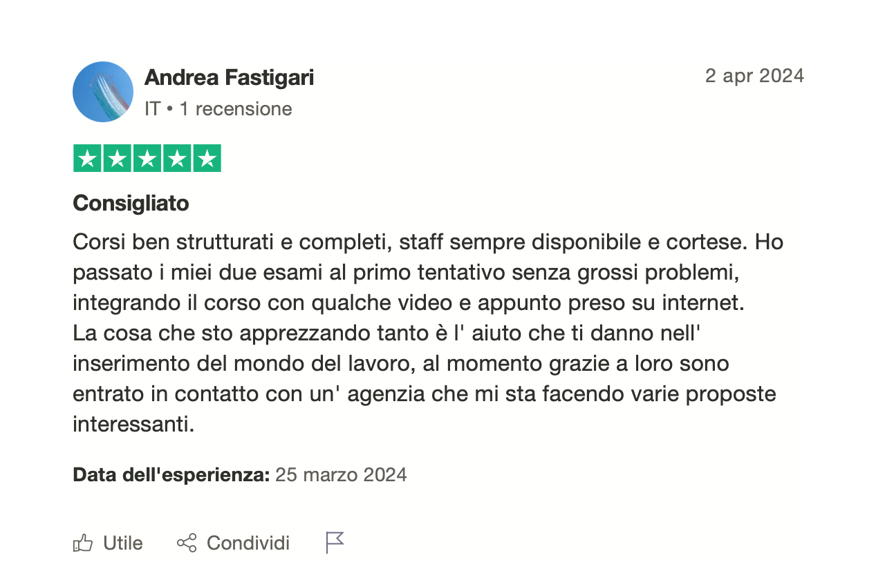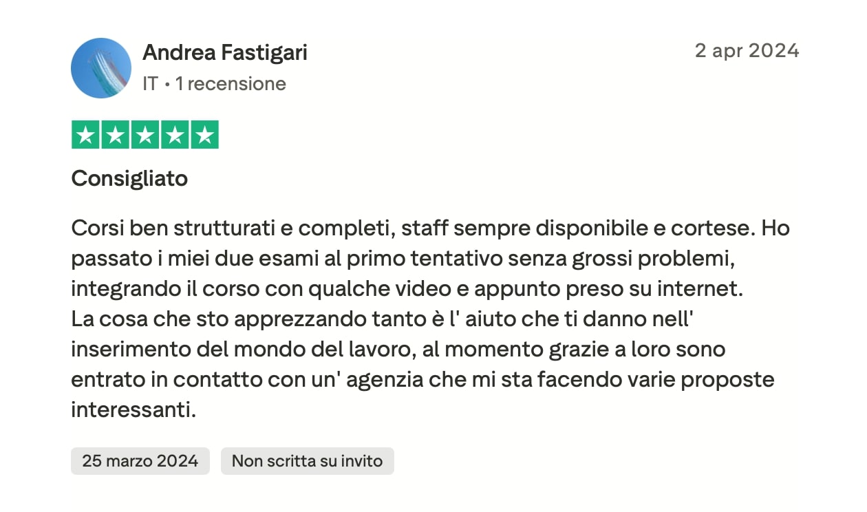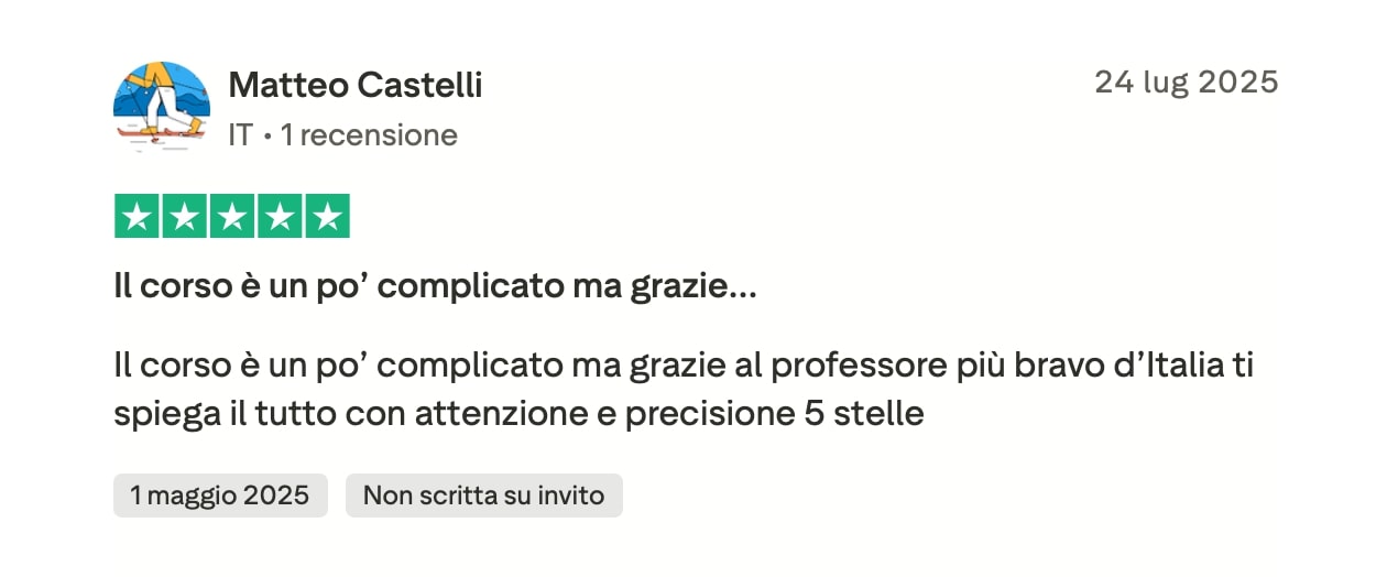 Verrai valutato direttamente dal docente Eugenio Fontana in una consulenza 1:1 pre-esame, per assicurarti di passarlo al 1° tentativo.