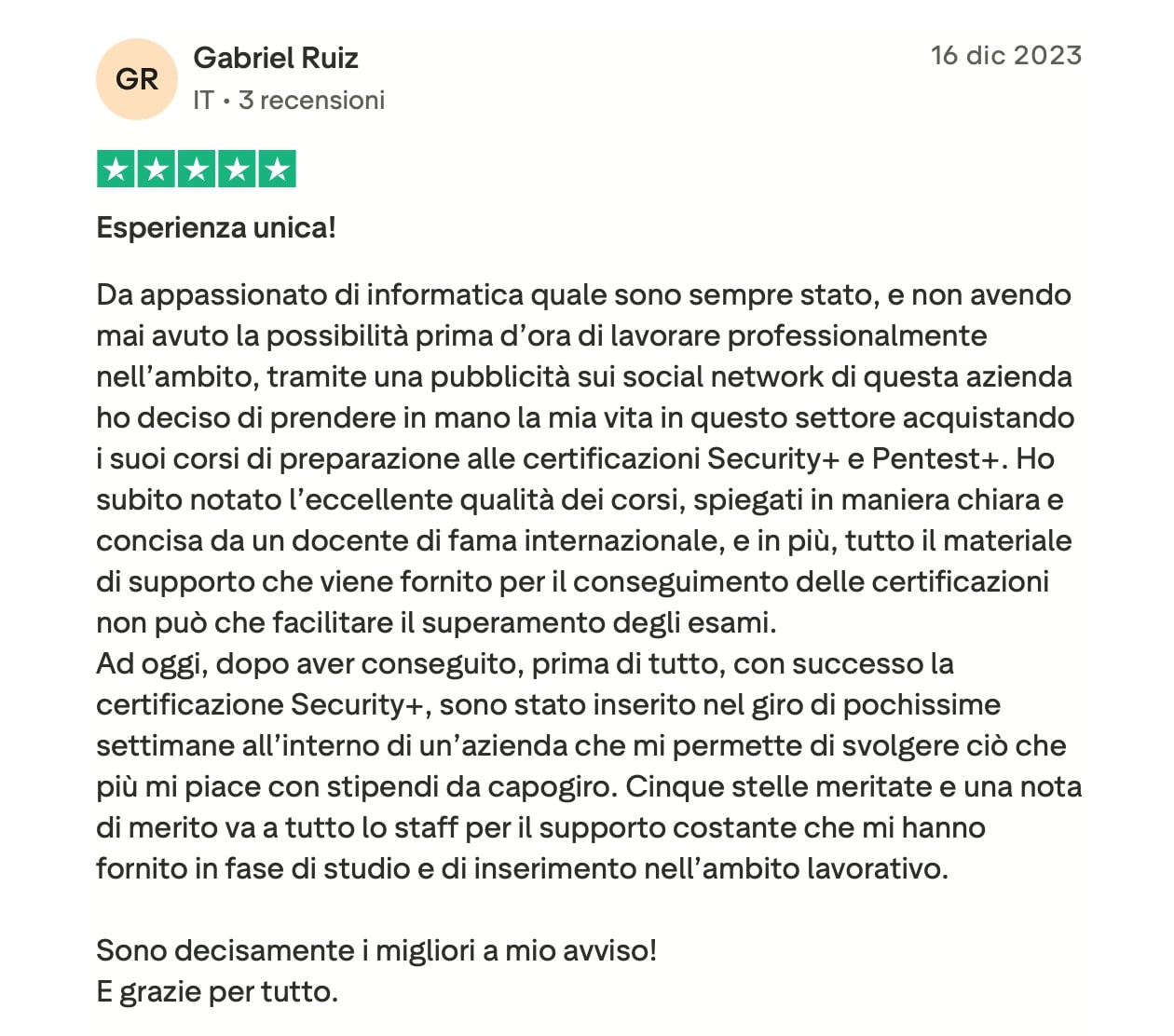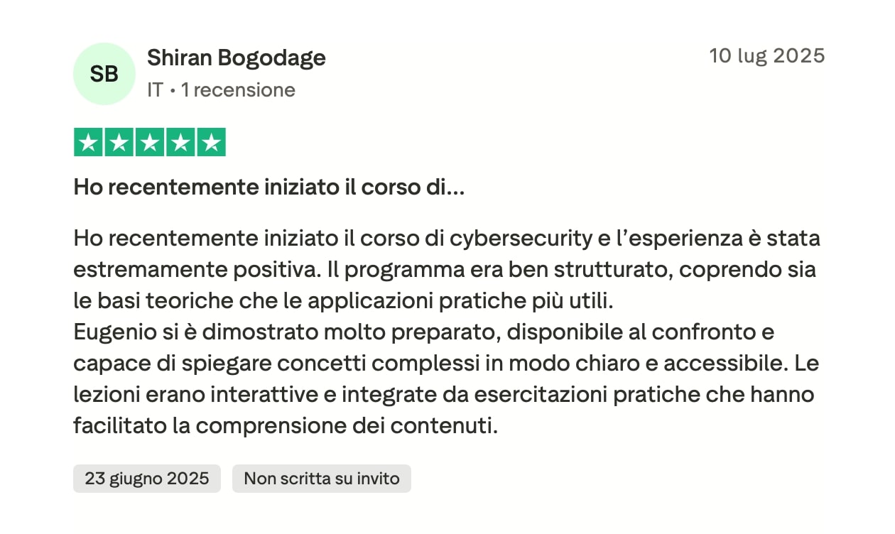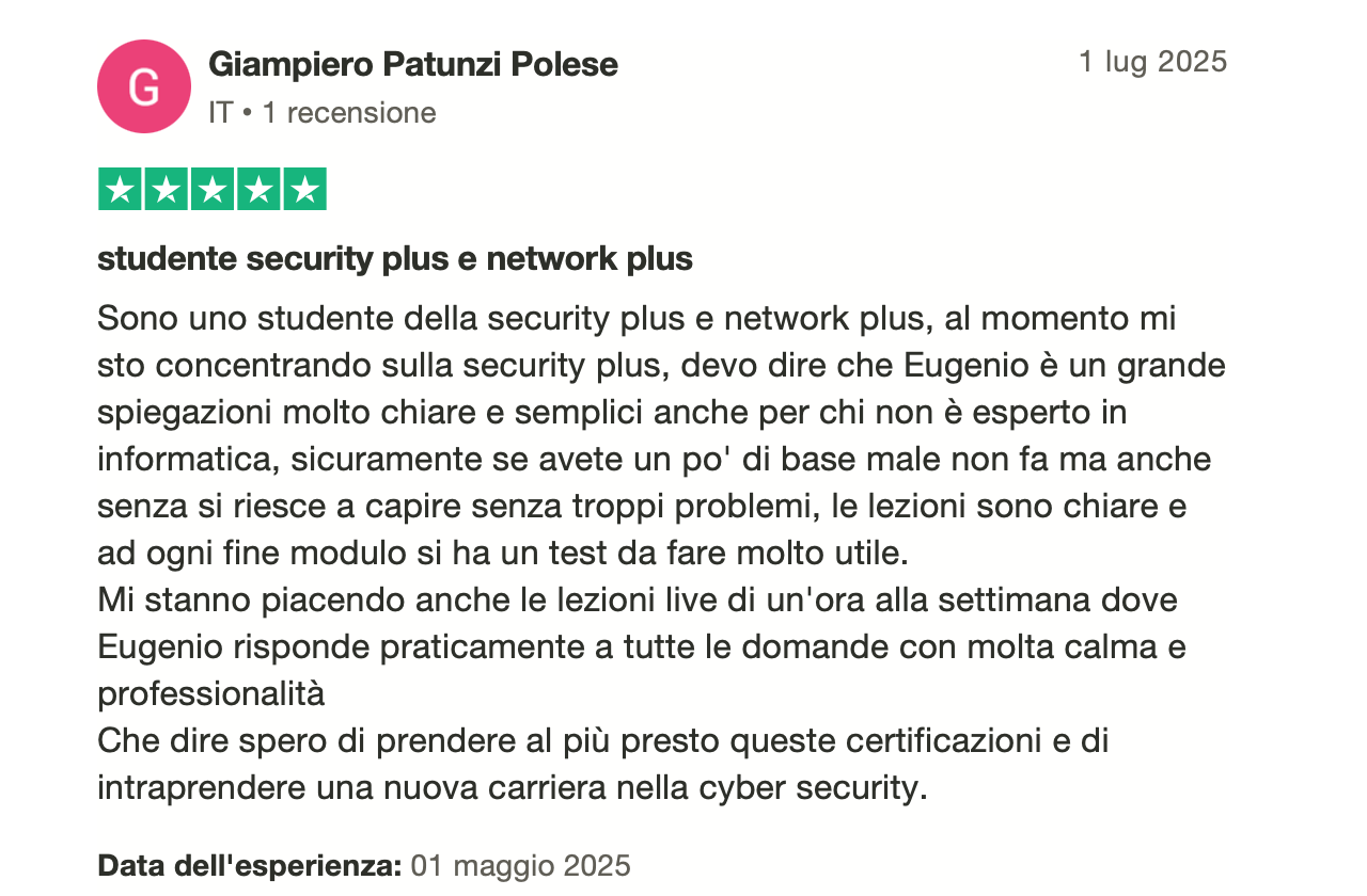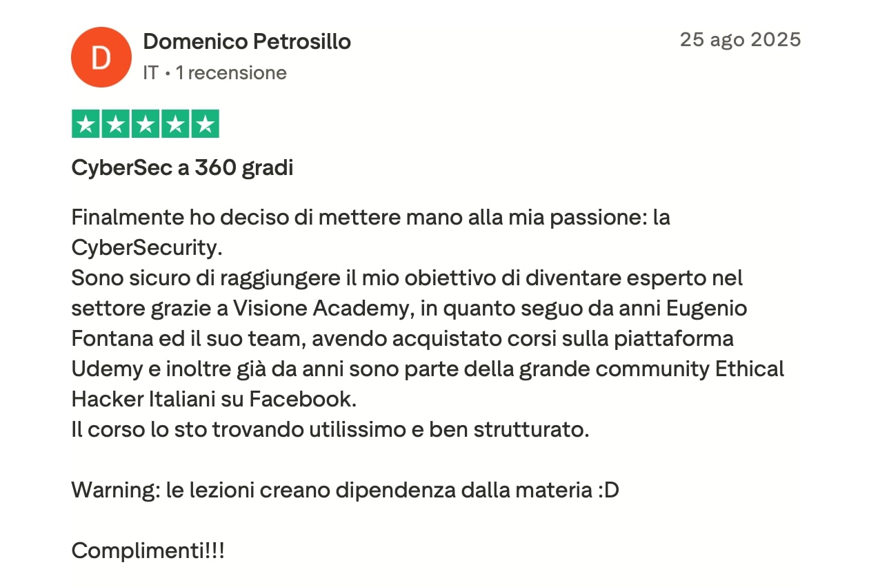 Parti dalle basi e segui un programma guidato con un docente riconosciuto come il miglior docente in Italia in cybersecurity, che rende i concetti chiari anche a chi non ha background tecnico.