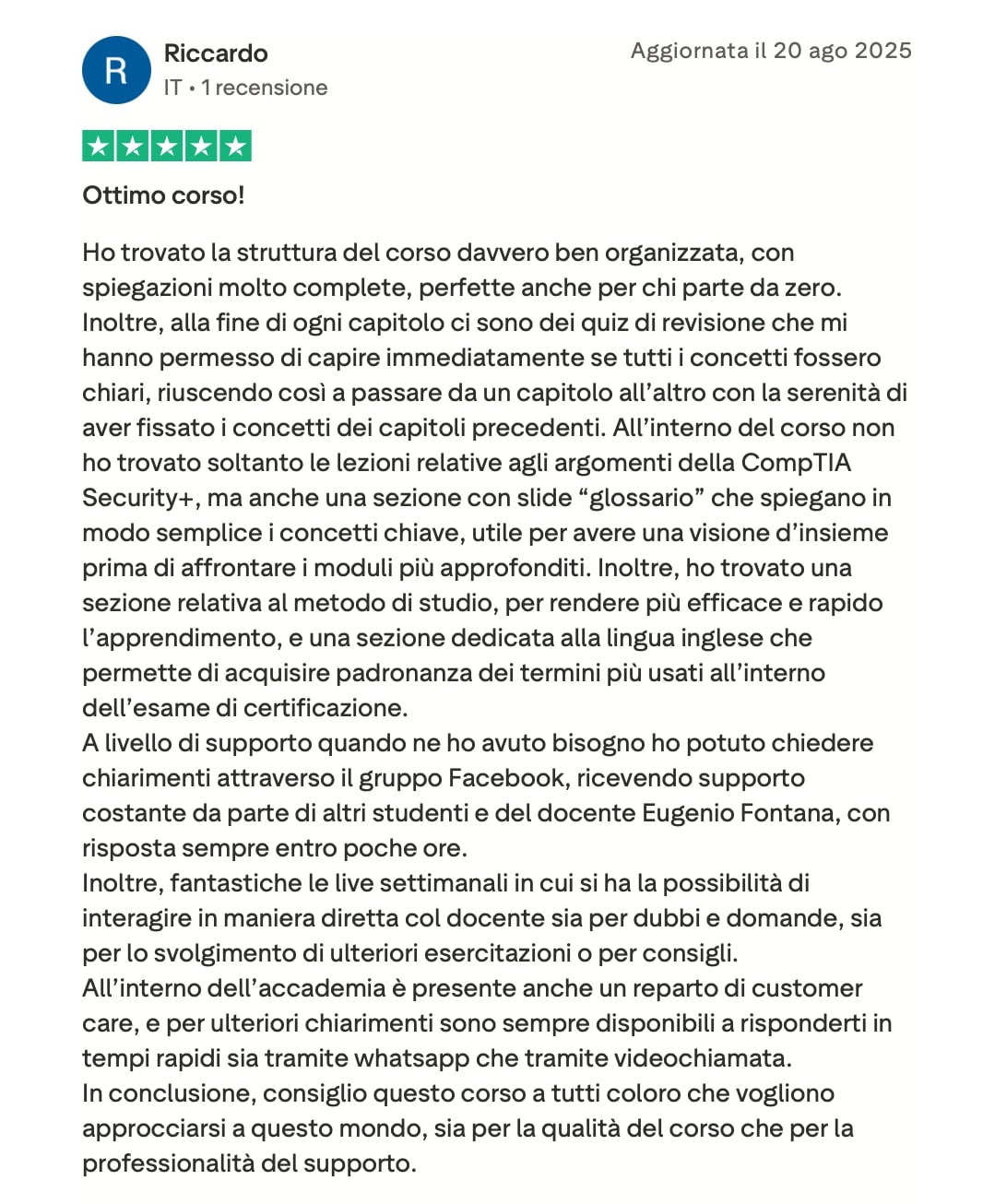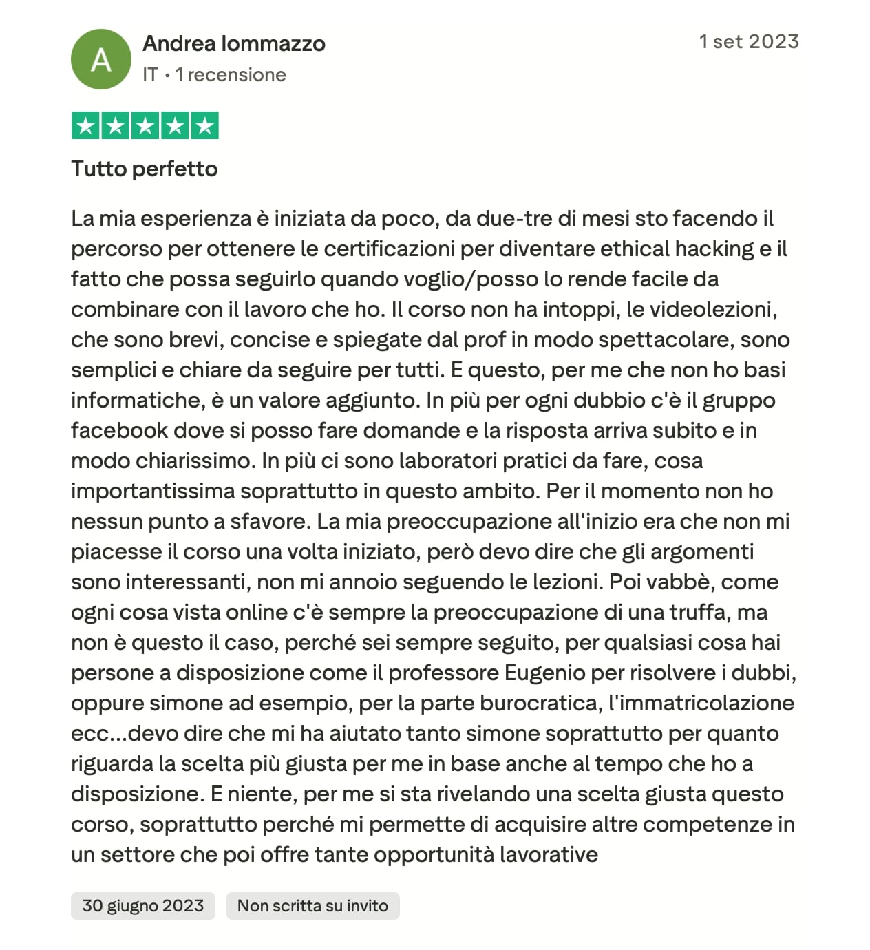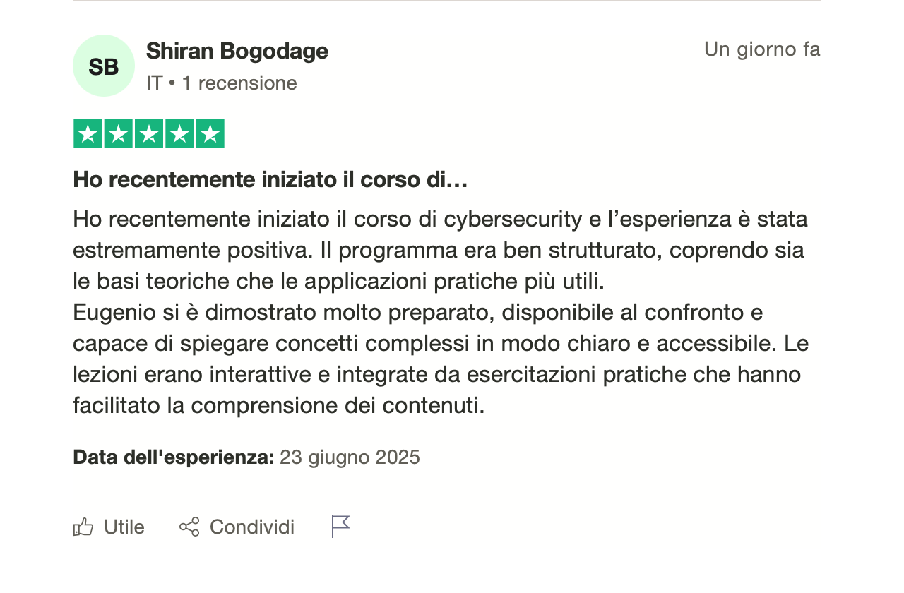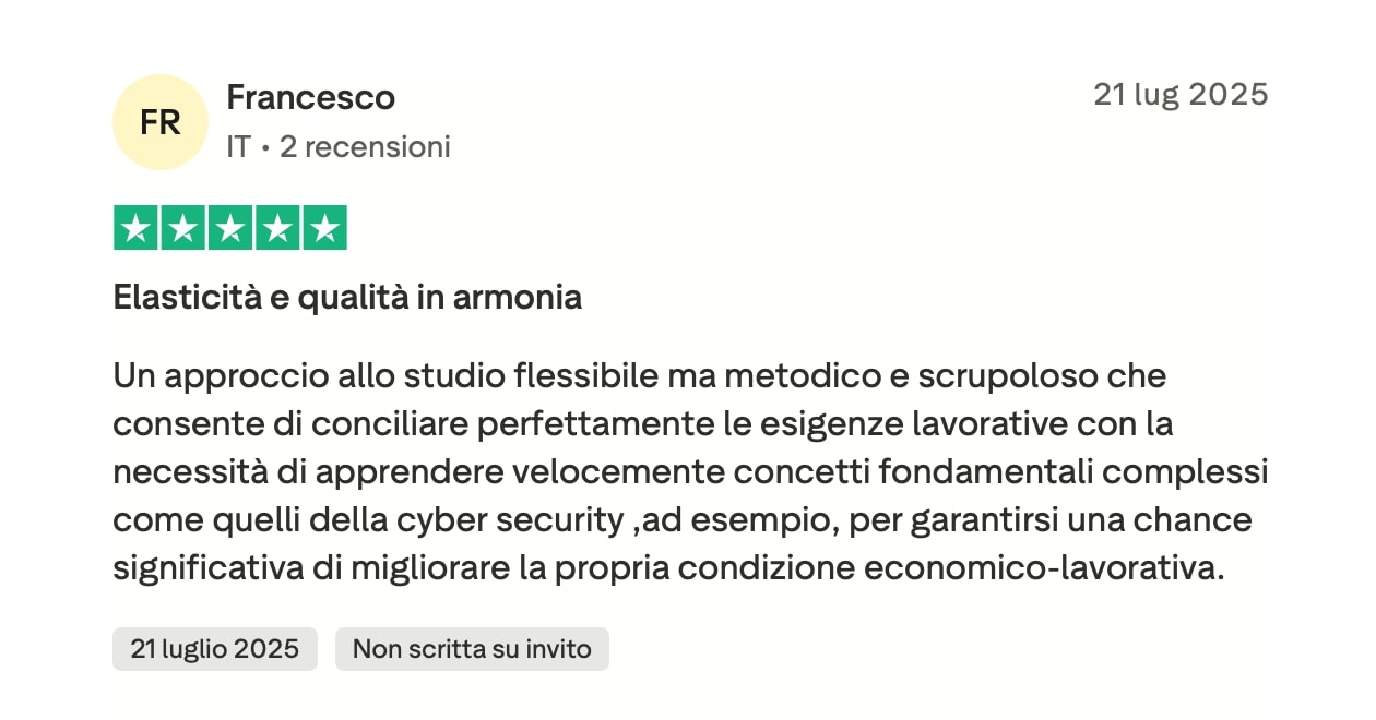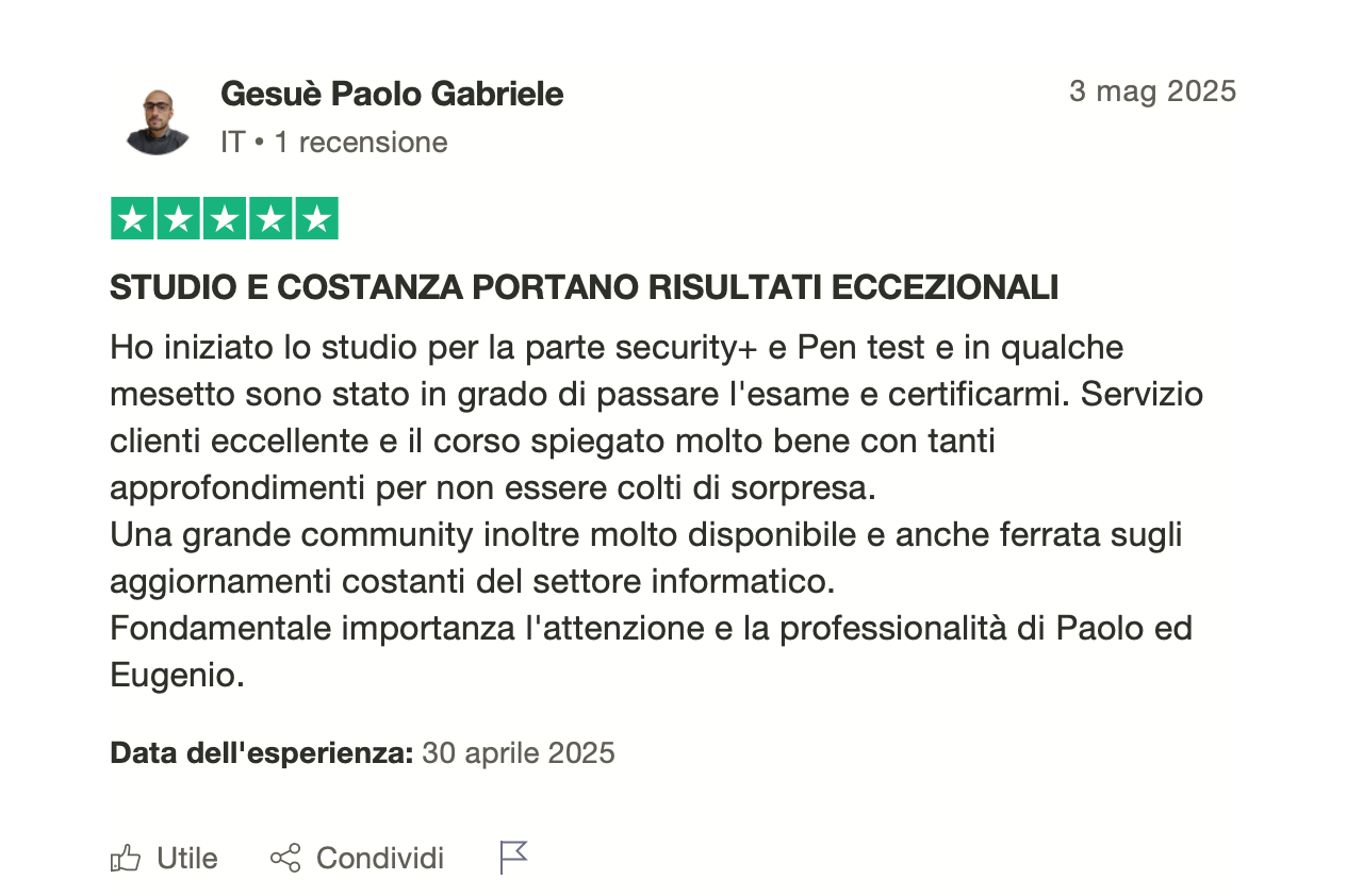 Parti dalle basi e segui un programma guidato con un docente riconosciuto come il miglior docente in Italia in cybersecurity, che rende i concetti chiari anche a chi non ha background tecnico.