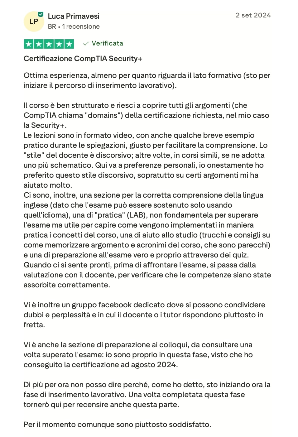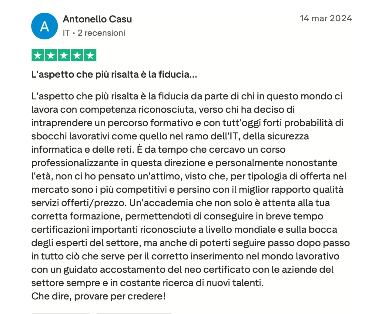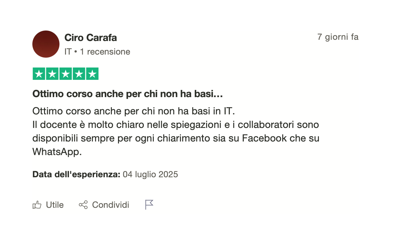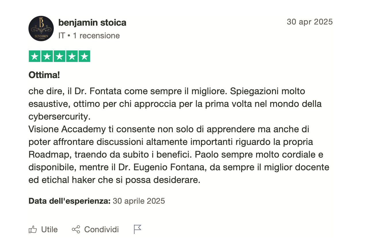 Parti dalle basi e segui un programma guidato con un docente riconosciuto come il miglior docente in Italia in cybersecurity, che rende i concetti chiari anche a chi non ha background tecnico.